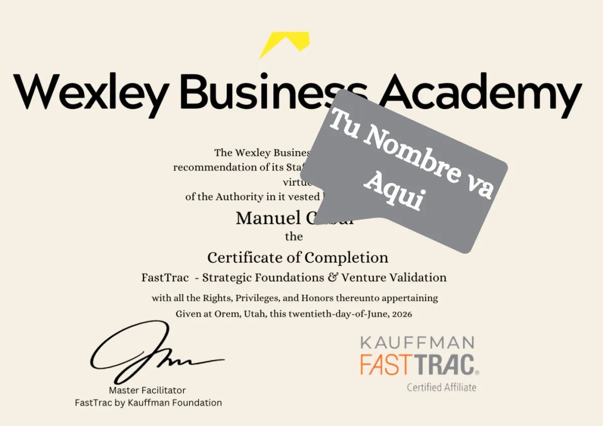 Sí, recibirás dos, una certificación oficial de Kauffman FastTrac® y también un certificado de reconocimiento de Wexley Consulting Group, lo cual avala que tu modelo de negocio ha sido validado bajo estándares internacionales.